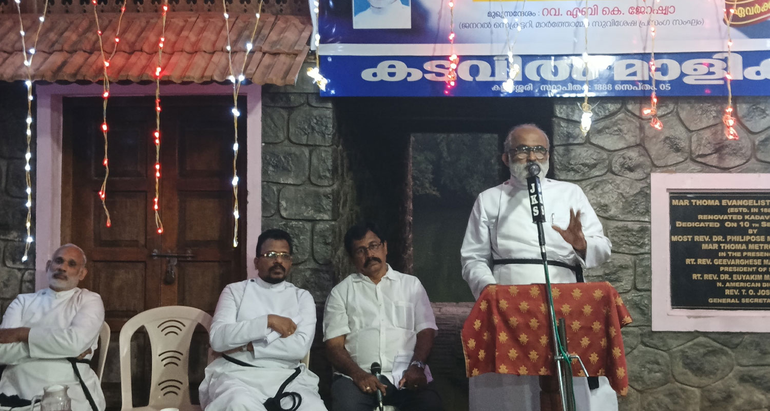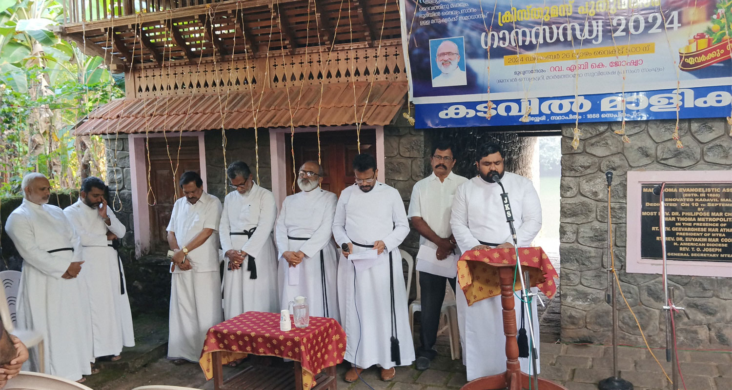 മാര്ത്തോമ്മാ സുവിശേഷ പ്രസംഗസംഘത്തിന്റെ ജന്മഗൃഹമായ കല്ലിശ്ശേരി കടവില് മാളികയിലെ ക്രിസ്തുമസ്-പുതുവത്സരാഘോഷത്തില് (26/12/2024) മാര്ത്തോമ്മാ സുവിശേഷ പ്രസംഗസംഘം ജനറല് സെക്രട്ടറി റവ. എബി കെ. ജോഷ്വാ മുഖ്യസന്ദേശം നല്കുന്നു. എല്.എ.സി. പ്രസിഡന്റ് റവ. ജാക്സണ് ജോസഫ് സമ്മേളനത്തില് അദ്ധ്യക്ഷത വഹിച്ചു. സംഘം സഞ്ചാര സെക്രട്ടറി റവ.ജിജി വറുഗീസ്, ട്രഷറാര് ഡോ. എബി തോമസ് വാരിക്കാട്, പ്രൊഫ.ഡോ. അജിത്ത് വറുഗീസ് ജോര്ജ്ജ്, റവ. റ്റി.എസ്. ഫിലിപ്പ്, റവ.കെ.എ.തോമസ്, റവ.ബെന്നി ഈപ്പന് മാത്യു, ഇവാ. ജയിംസ് വറുഗീസ് എന്നിവര് വിവിധ പ്രോഗ്രാമുകള്ക്ക് നേതൃത്വം നല്കി. ഉമയാറ്റുകര മാര്ത്തോമ്മ ചര്ച്ച്, ഓതറ സെന്റ് ആന്ഡ്രൂസ് മാര്ത്തോമ്മാ ചര്ച്ച് എന്നീ ഗായകസംഘങ്ങള് ഗാനങ്ങള് ആലപിച്ചു.