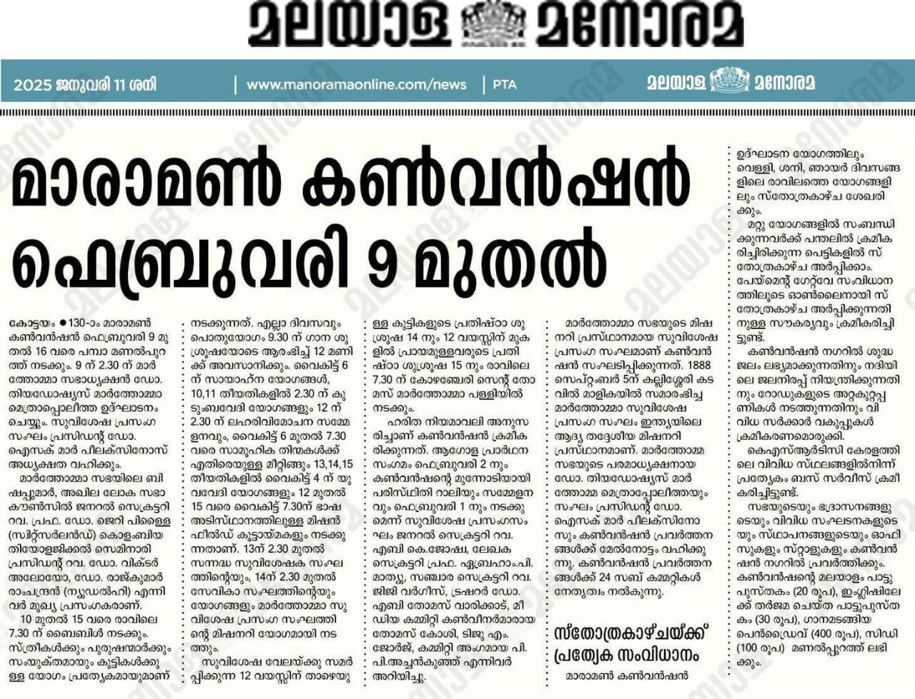 ലോക പ്രസിദ്ധമായ മാരാമണ് കണ്വന്ഷന്റെ 130-ാമത് മഹായോഗം 2025 ഫെബ്രുവരി 09-ാം തീയതി ഞായറാഴ്ച മുതല് 16-ാം തീയതി ഞായറാഴ്ച വരെ പമ്പാനദിയുടെ വിശാലമായ മാരാമണ് മണല്പ്പുറത്ത് തയ്യാറാക്കിയ പന്തലില് നടക്കും. ഫെബ്രുവരി 09-ാം തീയതി ഞായറാഴ്ച 2.30 ന് മാര്ത്തോമ്മാ സഭാദ്ധ്യക്ഷന് ഡോ. തിയഡോഷ്യസ് മാര്ത്തോമ്മാ മെത്രാപ്പോലീത്താ കണ്വന്ഷന് ഉദ്ഘാടനം ചെയ്യും. സുവിശേഷ പ്രസംഗസംഘം പ്രസിഡന്റ് ഡോ.ഐസക്ക് മാര് ഫിലക്സിനോസ് എപ്പിസ്കോപ്പാ അദ്ധ്യക്ഷത വഹിക്കും. മണല്പ്പുറത്തേക്കുള്ള താത്ക്കാലിക പാലത്തിന്റെ നിര്മ്മാണം പൂര്ത്തിയായി വരുന്നു.